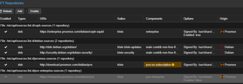 E: The repository 'https://enterprise.proxmox.com/debian/ceph-squid trixie InRelease' is not signed.