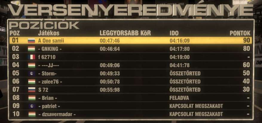 Amikor felnéztem az uccsó körben második voltam, és te voltál Dzsaver az első.Beértem, és akkor nézem, hogy én nyertem. De hogyan volt nem is tudom.