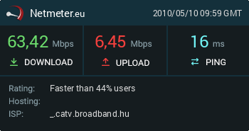 UPC 120/10-es net, ennel több nemigen szokott lenni a letöltés, a feltöltés általában 9-10 körül van.