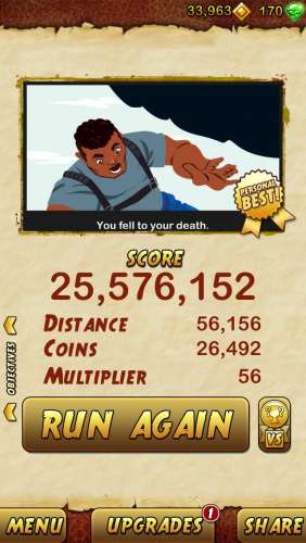 Nekem akkor kezdett elegem lenni a játékból, amikor a Gem-eket folyton olyan helyre tette, ahol szinte lehetetlen volt elérni. Amúgy jó játék, de ez a 10 millió méter akkor lenne reális, ha az egész család temple run lázban égne.