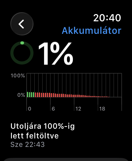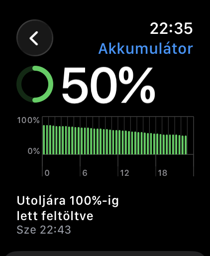 Lemerítve meglenne a 4 nap, így 1%-nál tettem fel 94 óra használat után. Szerda este vettem le a töltőről, vasárnap estig simán elment. (Az Ultra 2-nél 3 naponta töltöttem és lemerítve 78 órát tudott, szóval érezhető a differencia akksiidőben.)