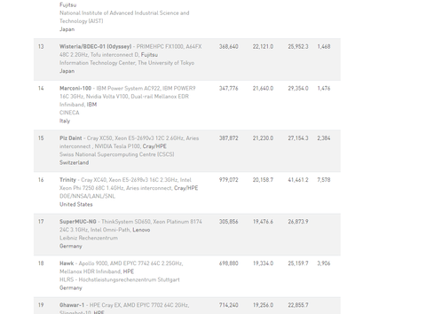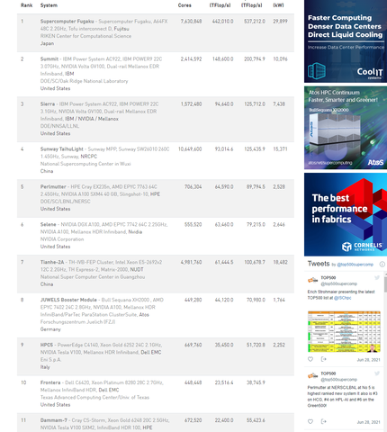 az 5. helyen Nvidia A100+ Epyc CPu kkal és mellanox összeköttetésekkel ami ugye szintén az nvidia tulajdona. a 8. és 9 helyen Nvidia V100 + mellanox xeon stb... [link]