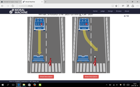 Mondanám, hogy szimulátorban próbálják ki sok emberen, hogy hogyan reagálnak, de azzal is sok a buktató és esélyes a hibás eredmény. Esetleg baleseteket nézzenek át, hogy döntöttek a sofőrök, helyesen tették-e, de akkor is ott van, hogy ember. A gépnek a károk/sérülések minimalizálása lehetne a célja talán.De abban is van valami, hogy nem ülnék olyan autóba, aminek az automatikája adott esetben úgy dönt, hogy feláldozható vagyok.