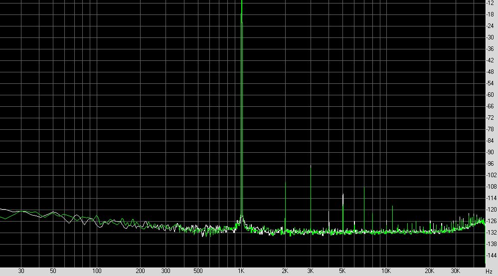 Ez a két DAC kapcsolástechnikailag pontosan ugyanaz, az egyiknél mégis klasszikus félvezetős harmónikusok láthatók, a másiknál pedig triódászerűen a páratlan felharmónikusok erősek. Hogy miért, arról őszintén szólva fogalmam sincs, de egyértelműen látszik, hogy valami nem stimmel. Annyi különbség van, hogy az I/V konverter végfokozata az elsőn egy OPA1612-ből ál, míg a másodiknál csatornánként OPA1611 van. Ugyanezzel a módszerrel kísérletezgettem ki, hogy milyen kondenzátorok a legjobbak az alulááteresztő szűrőbe, a kondik között egy nagyságrendbeli különbség van THD és IMD%-ban egyaránt! -