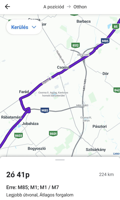 Köszönöm a választ. Már működik, de pl ha Hegyeshalomig tervezek, levisz Győr után a pályáról aztán később vissza. Jobbnak látom a 4 megyeit külön-külön kiválasztani.