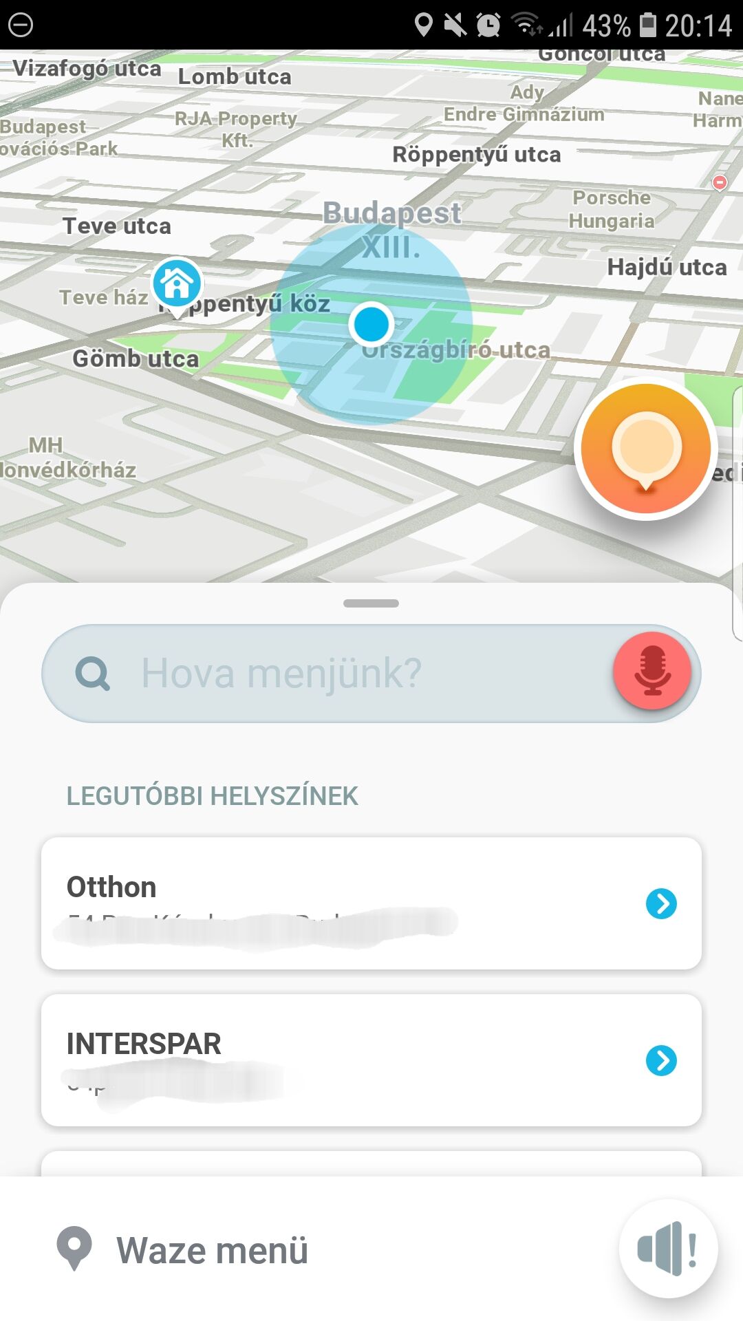 Waze menüre kattintva ugyanúgy ott az előzmény és a kereső sáv is!