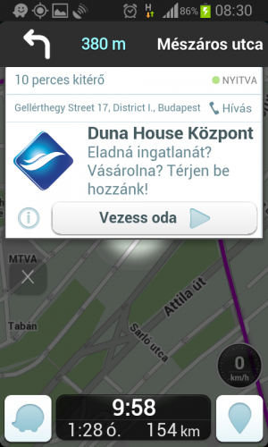 2. jelzés, hogy előttem 8 km-re útjavítás, cél előttem kevesebb, mint 3 km-re, szintén nem esik útvonalra a jelzésAsszem lenne még mit javítaniuk a fejlesztőknek - persze emiatt még használható a cucc, de nagyon zavaró, hogy felugrik az értesítés, csak éppen számomra nincs jelentősége, de elveszi a figyelmet egy pillanatra.