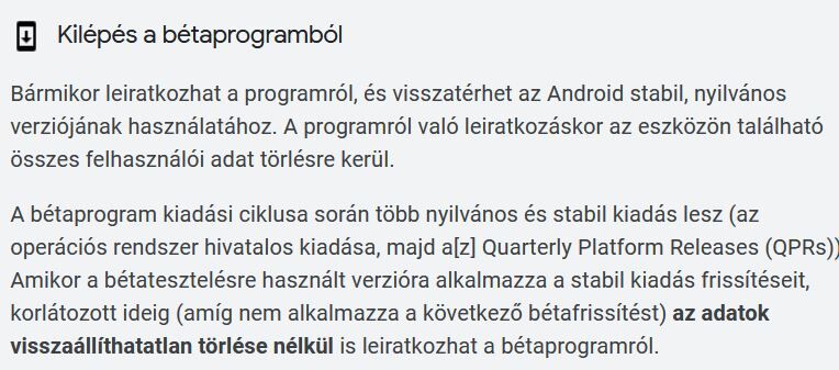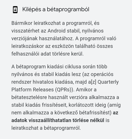 Ugyanott, ahol feliratkoztál, ott kell leiratkozni. [link] OTA-n jön majd a frissítés a stabilra. Viszont szerintem törlődni fog minden adatod ezzel. Ha nem szeretnéd, akkor sideloaddal tedd fel a legújabb stabil OTA-t, majd pedig utána iratkozz le a betáról, így elvileg nem törlődik semmi, de mivel én nem próbáltam, nem tudom megerősíteni. [link] videó róla: [link]