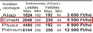 Megjegyzem: ez az állapot üdvözlendő, mert két vagy három éve, amikor bekötötték, minden csomag feleekkora volt. Én 1 Mbitesre fizettem elő 3 éve 7990 Ft-ot. Aztán pár hónap múlva szép csendben, szó nélkül megduplázták a sávszélességet. Így lett 2 Mbites 7990-ért. A plafon a 4-es csomag volt, aztán amikor behozták a 6-ost, lejjebb mentek az árakkal. Így most a 2 Mbites 5550-be kerül. Tehát az akkori szolgáltatás a 34%-a volt a mainak. Fele sebesség másfélszeres áron.
