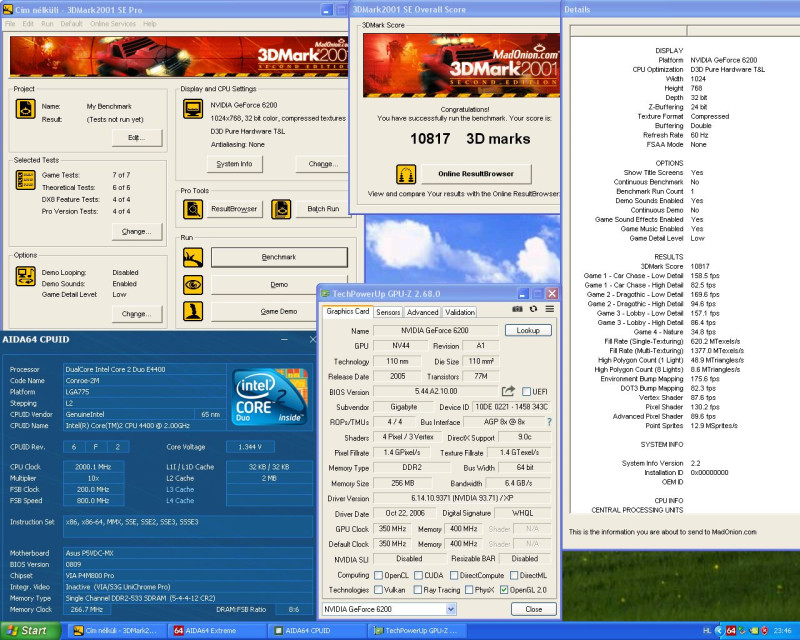 Core 2 Duo mellett 3DMark 2001 SE-ben 12000 pont fölé is mehet egy 64 bites 6200-as, tapasztalat. Ha lesz kis időm, talán össze is rakok egy ilyen konfigot, és teszek be képet az eredményről. Nem mindegy mondjuk, milyen 64 bites 6200-asunk van.