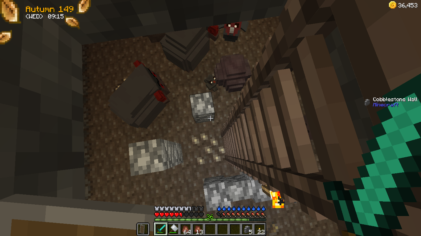 A nap vége: a gold szinten bedugult a bányám, nem találtam tovább lejáratot, pedig y 216 körül voltam még. Szerintem valamelyik fal mögé került. Addig lett 13 gold bizbasz, amiből a locsolókannát upgradeltem. 3x3-as lett az öntözött terület. Legközelebb majd Baltoval kilyukasztjuk a bányát, kell még ott szintnek lennie.