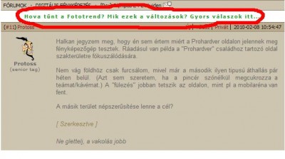 Csak jeleztem, hogy nekem nem tetszik ez a megközelítés/változás.Valamint lehet tévedek, de nem tartom feladatomnak, hogy minden linket, reklámot stb ami az oldalon van végig klikkeljek. A cimből számomra nem egyértelmű, hogy a prohardvert érintő változásokról van szó. Mivel nem olvastam a fototrendet eddig ergo nem is tünt fel, hogy változott. (Kicsit olyan celebes ez lassan minden tini azt hiszi, hogy attól hogy kék a haja és durci pofát vág a villamoson már celeb
