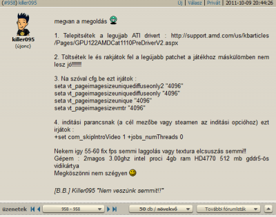 Persze a kapott tartalmat ki kell másolni, majd a játék Base könyvtárában a korábbi cfg fájlba beilleszteni. (eredeti azért mentsük el valahová, majd töröljük a tartalmát)Bár nekem sok gondom nem volt vele eddig sem, de a tegnapi új NV Driver és a megszerkesztett cfg segedelmével még szebb lett a látvány, továbbá eltűntek az 1mp-es "textúra után-rajzolások" is.