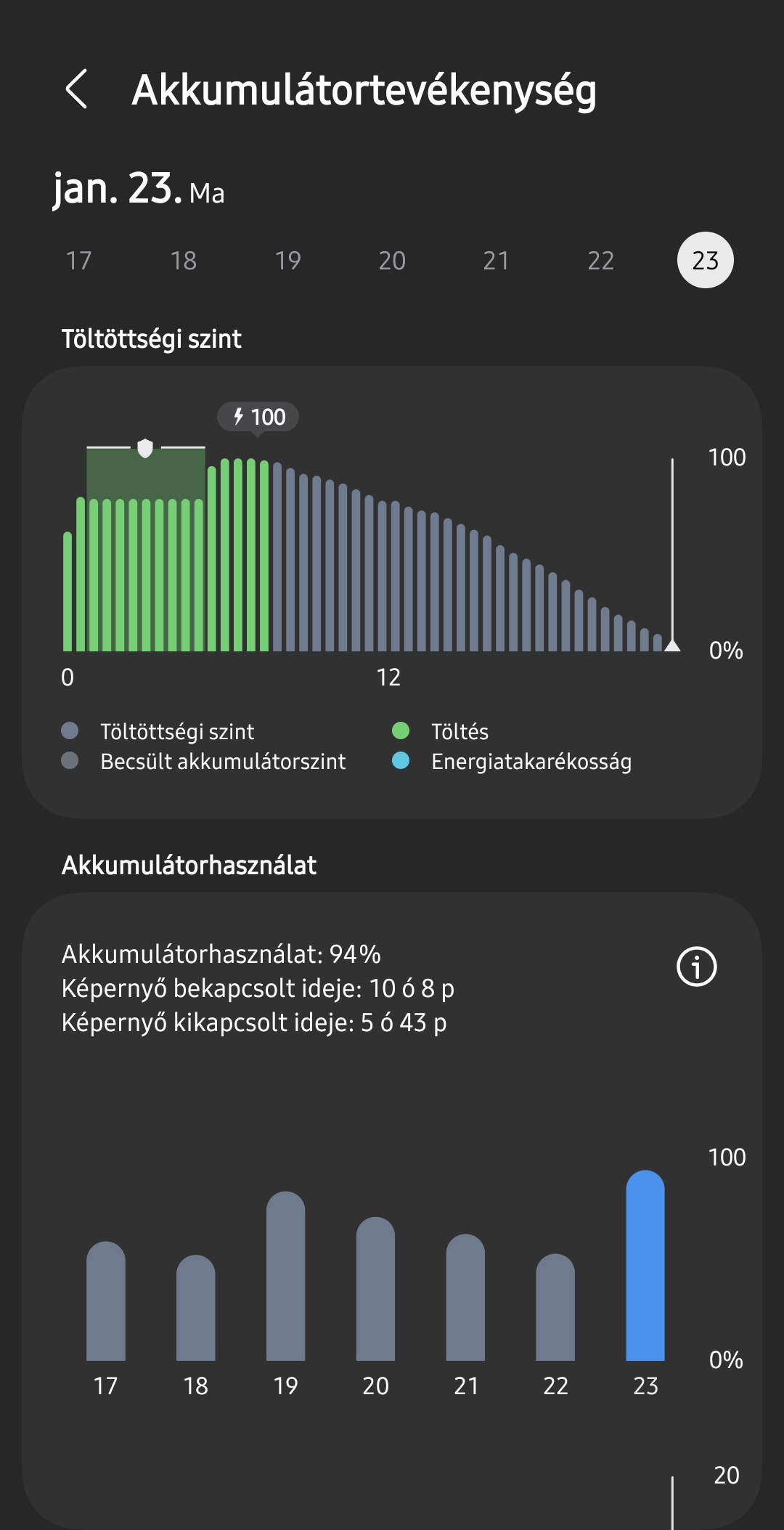 Viszont a felhasználói szokásaink nyilván nagyon mások. Én játszom, netezem, streamelek stb, aztán töltöm, amikor kezemre esik. Nem érdekel a százalék, akkor töltöm, amikor töltő közelében vagyok 😃 vagy amikor lemerül annyira, hogy kell, nyilván. De nem is mérek semmit különösebben, egyszerűen csak használom.