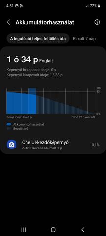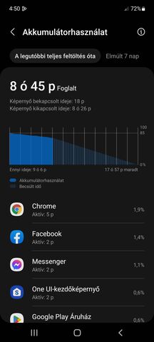 Sziasztok ismét! Tegnap este már nem foglalkoztam a frissítés telepítésével, így a mostani problémám nem fogható rá. Mielőtt lefeküdtem 85%ra feltöltöttem a telefont, kicsit még nyomkodtam de nagyon keveset, 84%-al tettem le, és reggelre kb 6-7 óra múlva 73%-ra lement a töltöttség úgy, hogy a net sem volt bekapcsolva. Vásárlás utáni napon teljesen jól működött a teló, teljes napot bírt az akksi, de pár nap elteltével látványosan romlott az állapota. Másnál is produkál ilyeneket a teló? Ez tuti nem normális egy pár napos készüléknél. Néztem az alkalmazásokat, de nem találtam semmi kirívó dolgot ami enné az akksit...