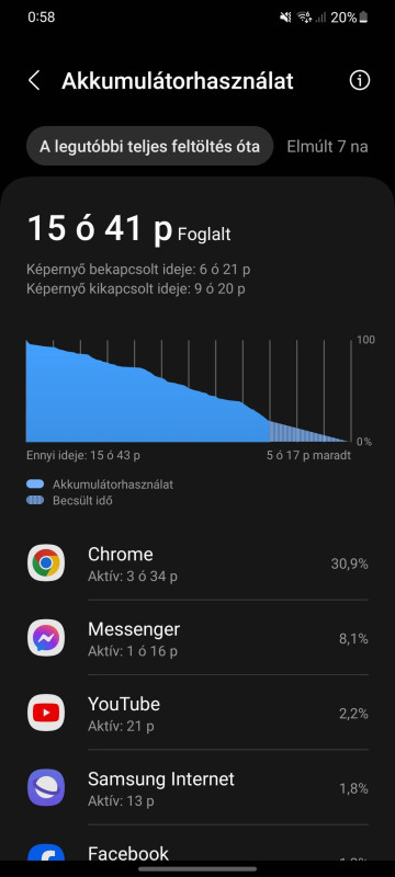 Sziasztok. S21-em ma úgy merült, mint a Titanic. Du-ig még nem is volt gond, vagy csak nem tűnt fel, melóban nem nyomkodtam túlzottan, de reggel töltőről vettem le, és úgy 5, negyed 6-ra már csak 10% volt, de rohamosan merült. Kocsiban feltéve töltőre (USB-n) alig töltötte, 3% körül volt konstans. Megnéztem du. az akku infókat, és a Samsung Health használt valami 20% fölött. Neten gyorsan rákeresve azt írták, a lépésszámlálót szüneteltessem az app-on belül, de nem igazán segített. Galaxy Store-ból nov.9-én volt egy frissítés a Health-hez, de ezt a radikális merülést igazából csak ma vettem észre. Lehet, hogy csak nem tűnt fel, mert itthon ált. munka közben vez. nélküli töltőre teszem a gépnél. Lehetséges, hogy ez a 9-ei update cseszett el vmt? Más nem tapasztalt hasonlót? Galaxy Watch órám van egyébként, bár ez mellékes.