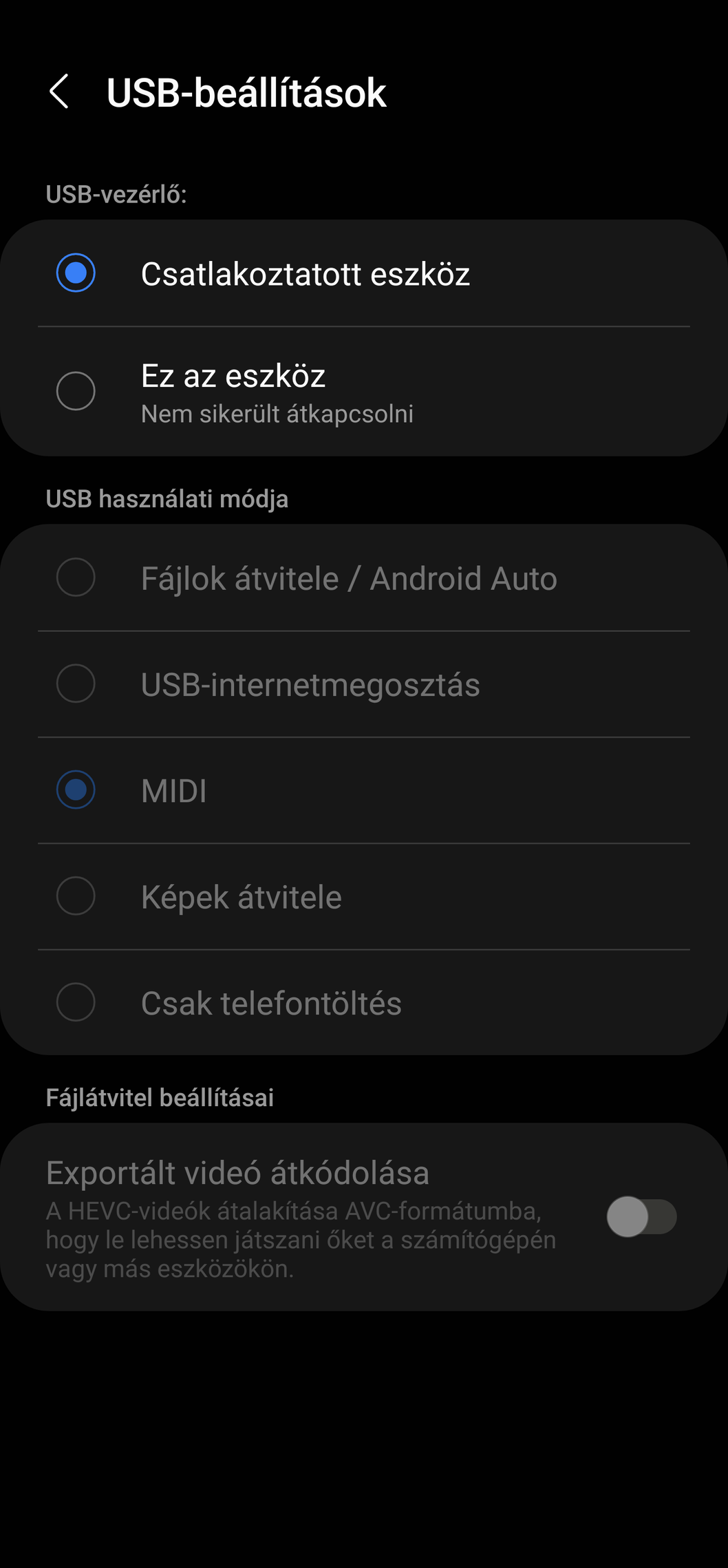 Használ valaki usb midi kapcsolattal szintetizátort a telefonra kötve? A gyereknek zongora tanuláshoz kötöttem rá a telefont a keyboardjára, usb-b usb-a kábel és otg adapter segítségével, de amint az oktató app kéri a midi kapcsolat engedélyt, elszáll az egész, a szinti hangszoroja reccsen egyet az s21u meg azonnal kikapcsol. Megállt bennem az ütő, hogy tégla lett. Szerencsére újra be lehet kapcsolni. Vettem már új kábelt és adaptert is, de ugyanez. S8-al működik, Laptoppal működik, így az s21u- ra gyanakszom. Lehet hogy tölteni akarja a szintit és zárlat lesz, menüben nem találom a beállítást ami erre vonatkozik.