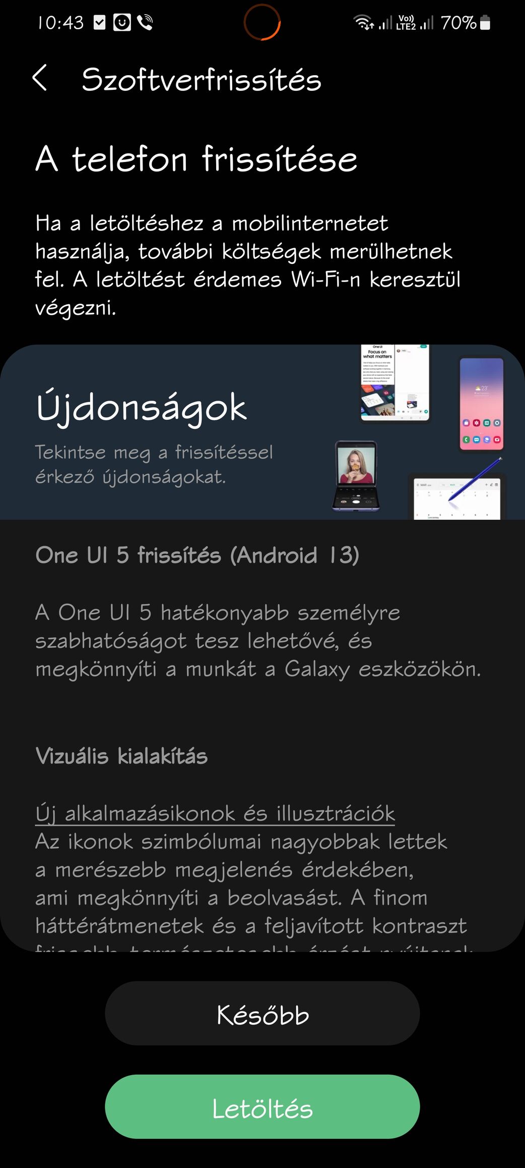 Sok apróság, nézz videókat róla youtubeon, pl.: Samsung One UI 5.0 vs One UI 4.1 (4.0) - 50+ Changes, New Features and Hidden Features!szerk: letöltöttem a smart switch-et pc-re, indítottam, kiírta hogy firssítsem az appot a telefonon is oké, megvolt, aztán volt egy szoftver frissítés gomb rányomtam, újra indította a telót (miközben épp másoltam le róla a képeket..) valami egyedi, zöld hátterű downloading módba, és szerintem épp csinálja az update-et, amivel én még vártam.
