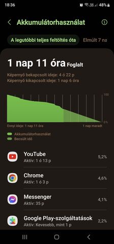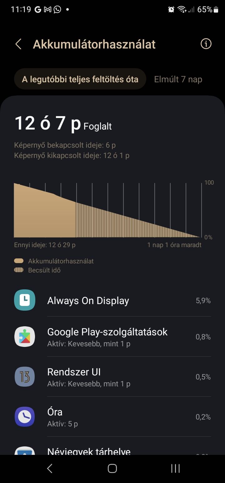 Nem tudom nálam mi változott, szokásos appok használva, kb. 1 óra Watch kapcsolat - ami újdonság - és épphogy meglett a 4 óra SOT (eddig 5- 5,5 szokott lenni). Nincs beállítva durva powersaving, QHD+, dark mode csak este, de szinte folyamatos wifi és szükségtelen dolgok off.