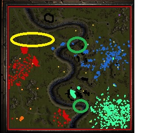 Középen van egy folyó, amin összesen 2 híd van, az egyik lent a másik pedig olyan 2/3-nál fent. A zöldek lent jönnek, a kékek pedig a felsőnél.Így néz ki a térkép:
