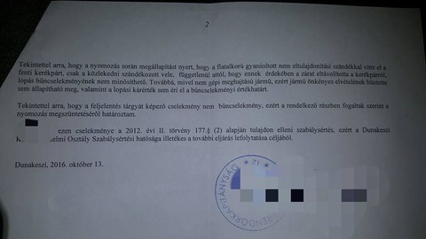 "A nyomozás azért került rnegszüntetésre, mert a Budakörnyéki Járási Ügyészség Gyermek- és Ifjúságvédelm i Csoport állásfoglalása értelmében a kérdéses eljáráshoz hasonló tényállású ügyekben a történtek nem minősültek bűncselekménynek. "