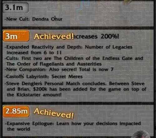 A Kickstarter oldalon az updates-ra kattintva láthatod azokat a pontosan megfogalmazott strech goal-okat, amelyek a megnövekedett pénzösszeggel végrehajthatók. Megnevezik pontosan kiket, és milyen feladatokkal fognak felvenni a projecthez, ha elérik az 1,5 illetve 2,0 milla USD-t. Összefoglalva:kibővített karaktergenerálás, kibővített sztori több helyszínnel, több zene, új csapattag.