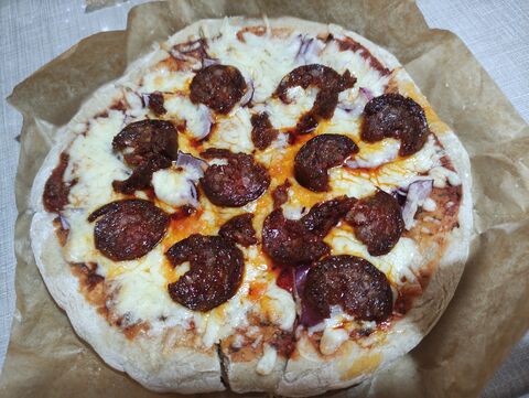 Kovászos pizza teszt volt Princessben, a tészta is sülhetett volna még meg a feltéten sem volt puha a hagyma így a hőfokot időt még ki kell tapasztalni + egyéb hibák a tészta is lisztes lett, de az látszik hogy jó lesz ez erre is néhanapján ha csak egy embernek kell.