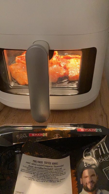 Ezután egy kis bolti grillkaraj sütés, aláöntöttem fél deciliter vizet, mert ebben van wet roasting funkció: