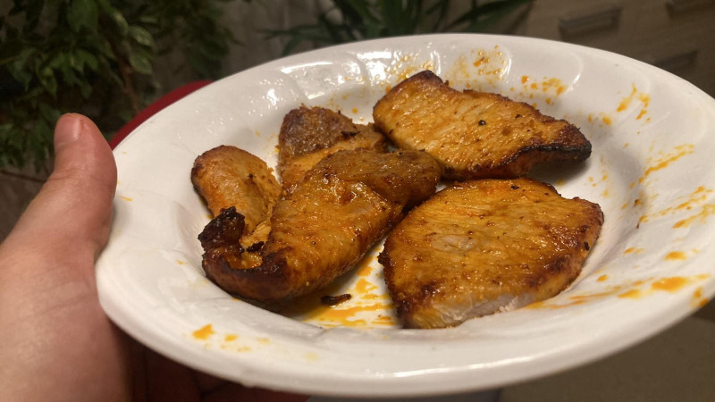 Itt már rácsavartam a kakaót 200 fokra. Izgultam első hús sütésem révén, így 5 percenként forgattam a sülteken. 15 perc körül már a felét kivettem, utána pár perc múlva a többit is. Tányérért bocsi, kicsit összekentem.
