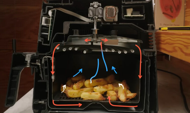 A képek alapján ez a Tefal egy fura jószág, nem mutatja hogy a kosarat körüljárja a forró levegő, hanem szerinte az ételen kellene keresztülmennie. Nálam az ételt tartalmazó kosarat alulról körül tudja járni a forró levegő, mint ezen a képen. Szóval akkor nem általában az egykosarasokkal van a gond, hanem ezzel a bizonyos típussal, jó tudni