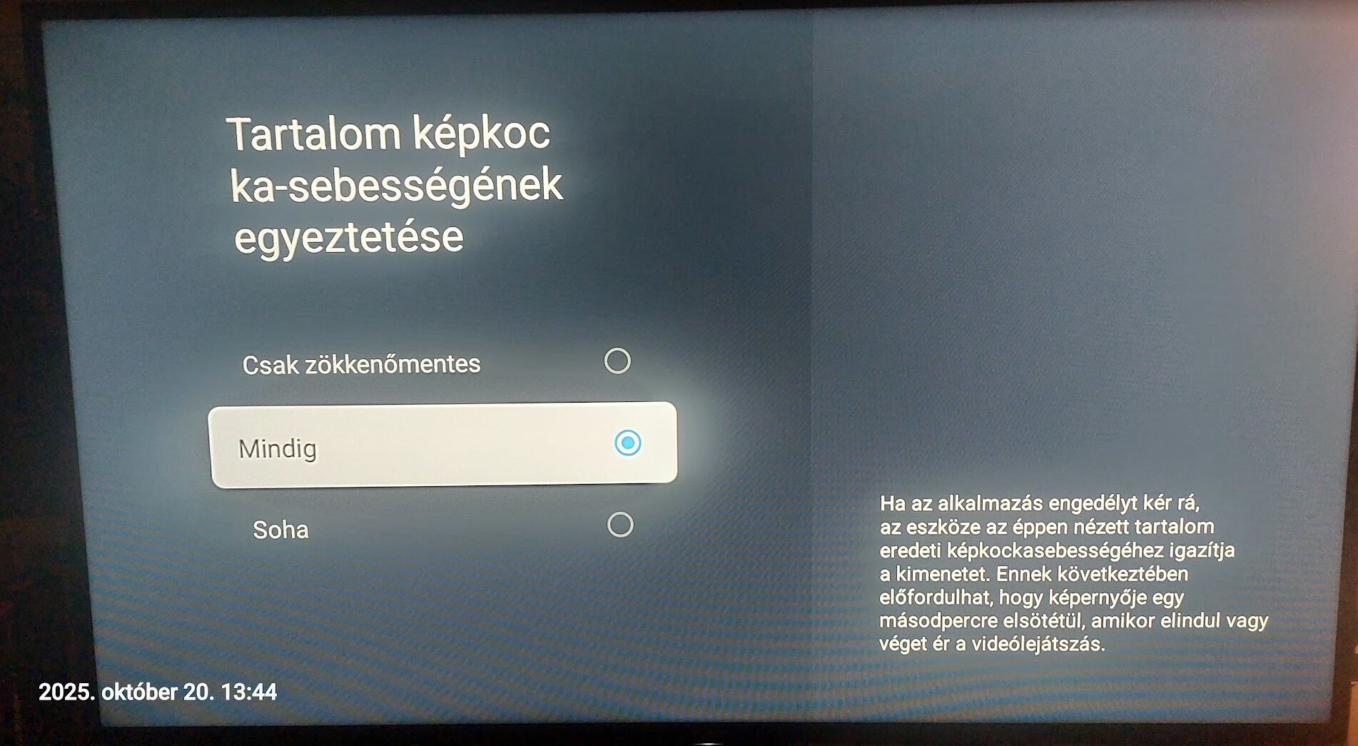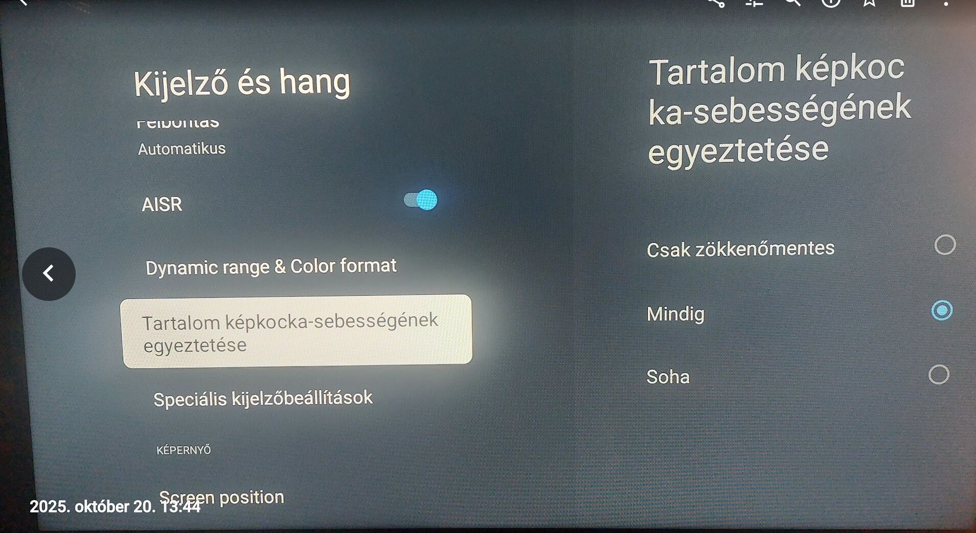 Valahogy be állítható úgy a képfrissítést hogy kadenciahelyes legyen? Tehát a HBO az 50hz-en megy a sweet is viszont a disney+ az 24 en. Van erre valami mòd hogy mindig úgy kapcsoljon ami a helyes? Beállítható azt tudom de nem mindeigyik streaming megy ugyanazon a hz-en.
