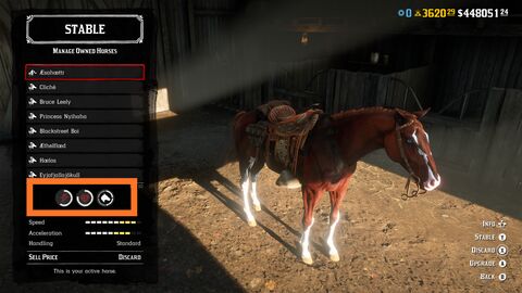 Free Roam Menu (ez kontrolleren a D-Pad balra, vagy PC-n az M betű), ott a Stables menü pont, azon belül pedig Horses-->Specialty. Ezen belül pedig ki lehet választani, hogy milyen lovat akarsz használni Race, Story Mission, Competitive, Free Roam-ban.