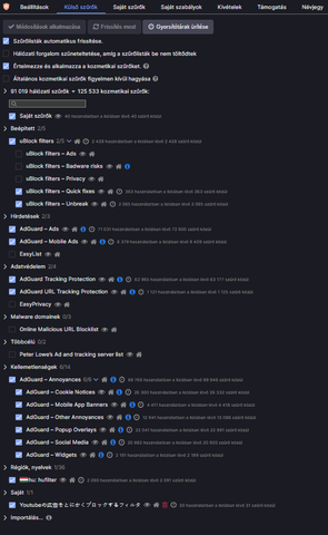 - Fanboy AnnoyancesMegnyitottam az ublock vezérlőpultját és nagy meglepetésemre a második linkre, a külső szűrőkre kattintva mérgesen láttam, hogy ezek és mások is ott vannak a listában, csak éppen nem voltak bekapcsolva, most megtettem, majd kiderül, mi lesz később, mindenesetre köszönöm!