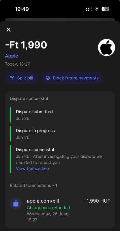 Kértem refundot Apple-től is, biztosra megyek. Egy olyan előfizetést is le akartak vonni, ami annak idején sikertelen volt, mert nem volt pénz a revon. Így aztán Apple Pay-el és másik kártyával fizettem, erre nem is tudott refundot kérni a supportos most. Mivel nem tudjuk a részleteket, én beszántottam a kártyát, biztos ami biztos. Egy ilyen blama esetében elvárnék valami kommunikációt Apple részéről, eddig csak hallgatás van, ami nem túl szimpi.