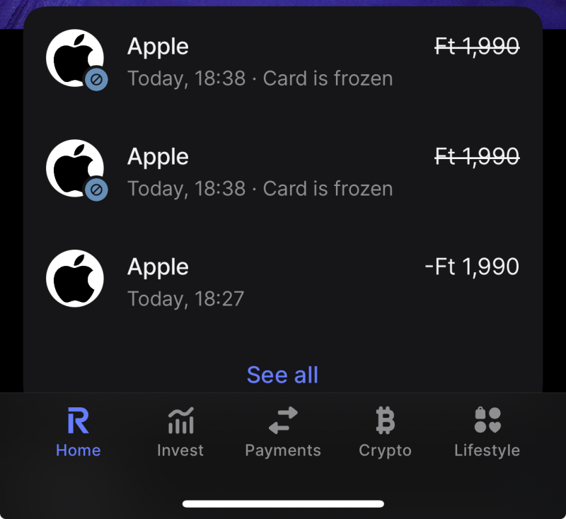 A Revolut-ot is elérte a BIN Attack. Az egyik régi virtuális kártyámat használták. (Kettőt használok.) Ráadásul Apple vásárlás volt 1,990Ft.-ért. Úgyhogy mint már a Wise Topic-ban jeleztem nagyon figyelni minden számlára. Nemsokára jelzem a Revolut-nak. Miközben írok most is próbálkoznak.