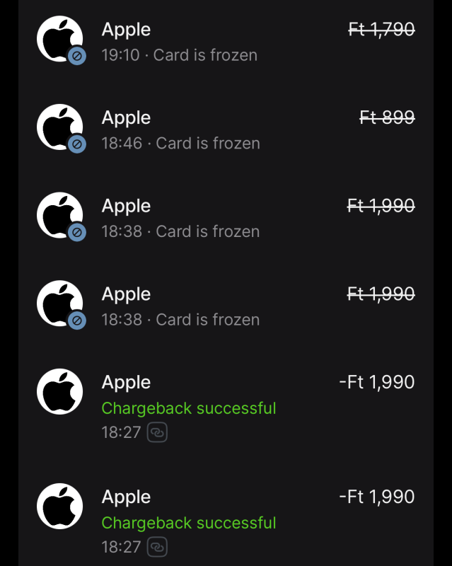 Azzal a kártyával fizettem is az App Store-ban és előfizetési havidíjat is vont le. (párszor) Aztán átrendeztem a dolgokat és utána távolítottam el az Apple ID alól. Íg már érthető miért is tudta levonni utólag. Végignéztem a tranzakciókat a Revolut és az Apple oldalon. Ami nem teljesen egyértelmű az 1,990Ft. Lehetett egy App vásárlás (és utána Refund) vagy egy App-on belüli vásárás. Mivel kettő ilyen összegű vásárlásom volt. De ez nem visszaélés hanem az Apple oldalon van /volt valami gond.