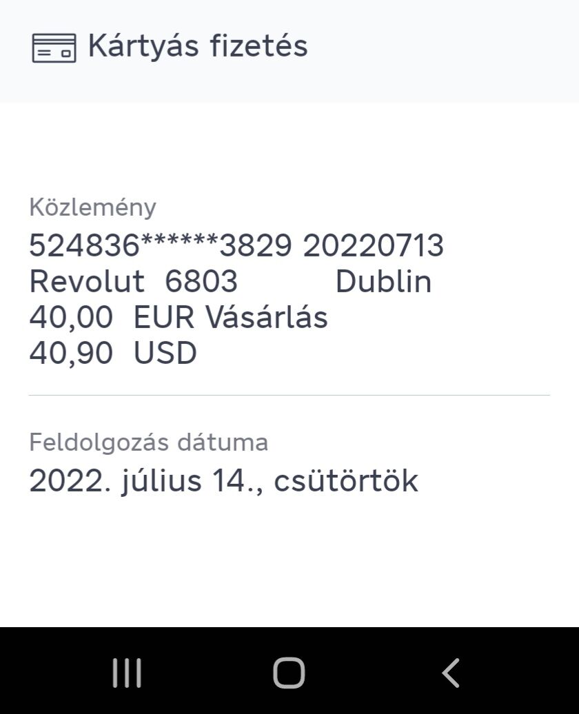 Raiffeisent probaltam elsonek 120€-val arra nem vont le,metal csomagban vagyok.Aztan kuldtem 60€ ott mar 0,42€ szamolt.Es ios-on.Droidos-on meg nem is neztem. -