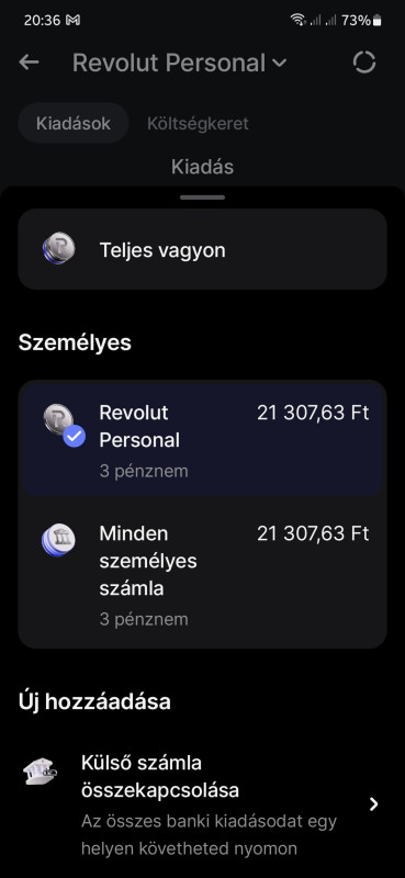 Azon a részen ahol a kiadásokat lehet nyomon követni, van egy menü, hogy "Külső számla összekapcsolása".