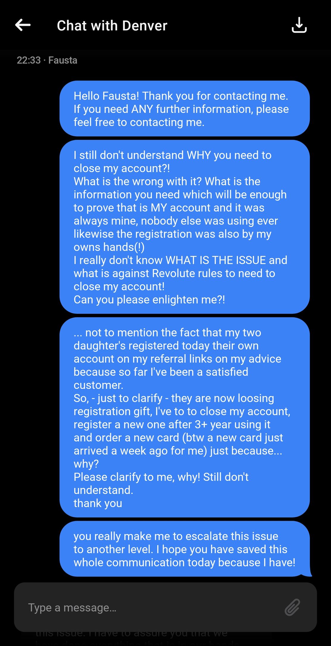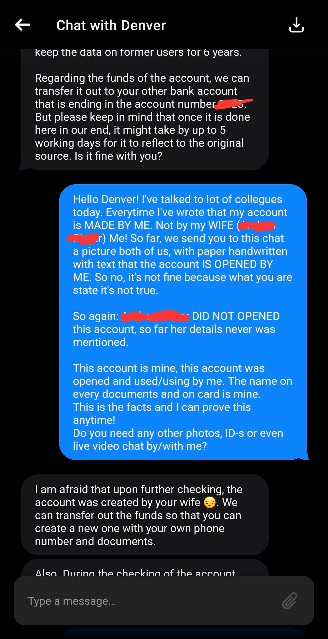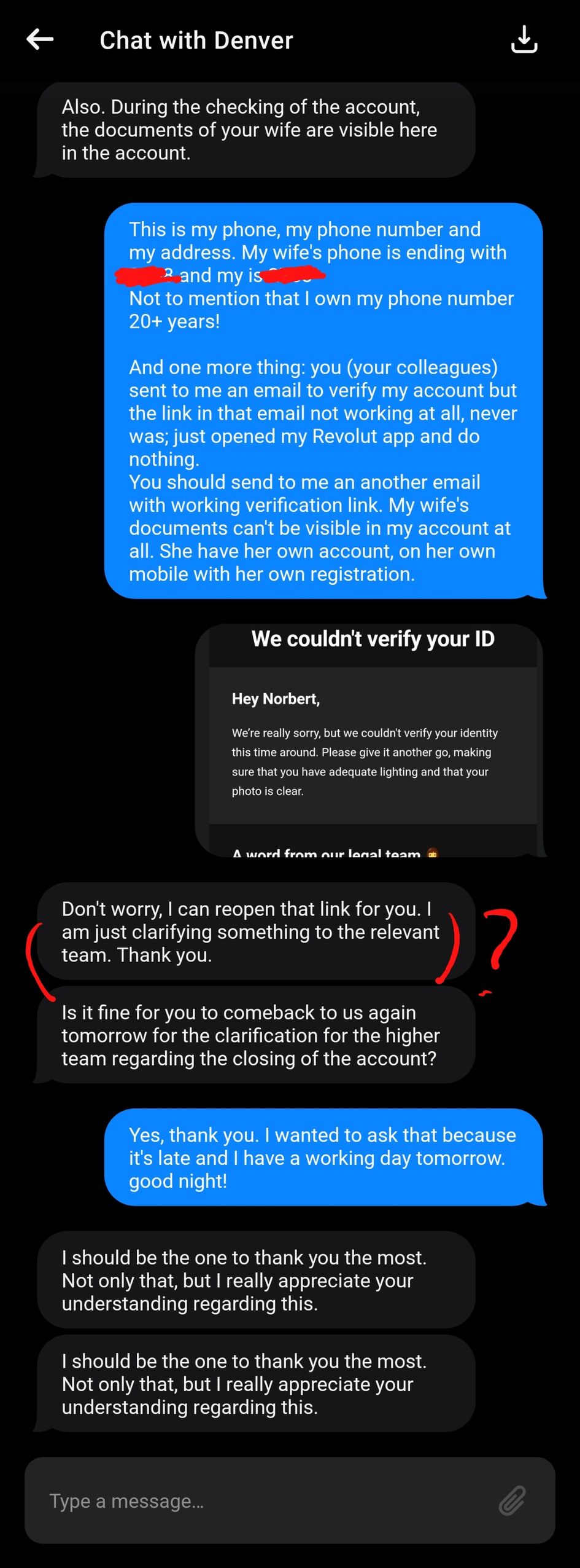 ...érdekes, hogy miután látták, hogy tarthatatlan vagyok, határozottan állítom mindvégig, hogy nem a feleségem, ÉN nyitottam a saját accountomat 2019 elején, a feleségemnek semmi köze hozzá, annál is inkább; neki van sajátja, amit vissza is igazoltak, az accountom alatt soha nem fordult elő a neve, email címe, telefonszáma (ezek egy része át sem írható!), és megemlítettem, hogy egyébként valamikor délután még kaptam is egy verification emailt, melyben a link nem jó, mert hiába bökök rá, megnyitja ugyan az appot, de nem történik ott semmi (a szokásos: fotó az ID-k két oldaláról+szelfi igény. em történik meg), akkor már azt írja, hogy "megnyitja" nekem újra azt a linket, csak előtte egyeztet (egy újabb) csapattal, és türelmem kéri, alázatosan elköszön... azt bezzeg egyszer sem ajanlotta fel, hogy akkor kiutalják a két reflinkes regisztráció után járó giftet és ingyen postáznak majd nekem új kártyát, ha nyitok új accountot, csak tegyem meg a kedvükért (amit továbbra sem értek miért... de jó. legyen. úgy még el is fogadnám talán
