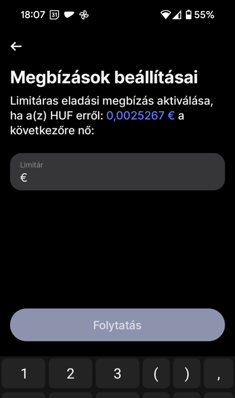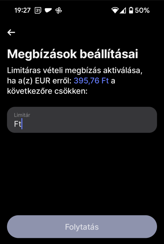 nem biztos, hogy értem. Megnyomom az átváltás gombot, hogy eurót szeretnék venni.Majd utána felül kiválasztom a limitáras megbízást, és ezt látom. Nem tudok másfelől közelíteni...