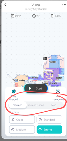 Mondjuk a feltérképezéshez érdemes eleve a legkisebb szívóerőt beálítani, strongban persze hogy jobban fogja szívni az akksit is. Nálam 30m2 után 75% van, standard szívóerővel.