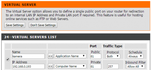 - a routerben be lett állítva port forwarding / virtual server (először az egyiket próbáltuk, majd a másikat)