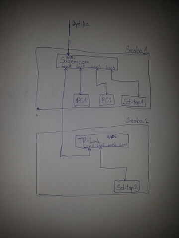 Szoba 1-ben a Sagemcom csatlakozik 2 darab PC-hez, 1 darab Set-top boxhoz (fő box) és egy UTP átmegy a Szoba 2-be a TP-Link routerbe. A Sagemcom Lan 1-ből vezettem át a kábelt a TP-Link LAN 1-be. TP-Linken kikapcsoltam a DHCP-t. A TP-Linkhez csatlakozik még egy második Set-top box.Természetesen mind a két Set-top végén található még 1-1 TV.