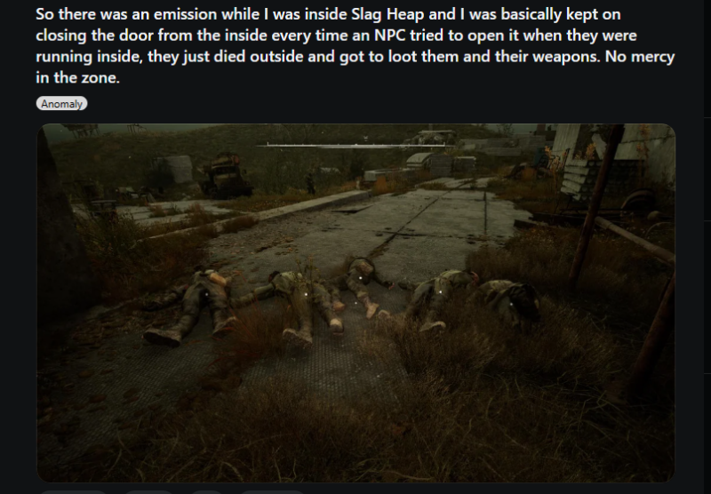 A Szeméttelepen, a stalker bázison lehet felvenni egy küldetést, miszerint a társuknak vodka kell sugárfertőzésre, de nem emlékeznek, melyik rejtekhelyre kell lerakni, ezért 3 lokációt kell felkeresni. Ugyanakkor nem szabad kivenni semmit a stash-ből. A detektort tartalmazó csomagba betettem a vodkát, kiléptem belőle, majd visszalépve kivettem a detektort, és így már nem reklamál a rendszer.