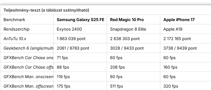 1 evvel ezelotti (jo, gyakorlatilag mar masfel eves) proci van benne a csucsbol. Azert ez minden, csak nem A szeriaba valo. Ott max. fele ekkora teljesitmenyu hardver van. Az exynos 2400 meg a Snapi 8 elite kozott peldaul egy ekkora hazban, azonos hutessel az Antutus kulonbsegek nagyjabol ilyenek: 1.800.000 vs 2.300.000. Van kulonbseg, 25 szazalek teljes terhelesen. De azert ez a normal napi hasznalatnal csak az akksi kevesbe merulesen tunik fel, masban nem igazan.