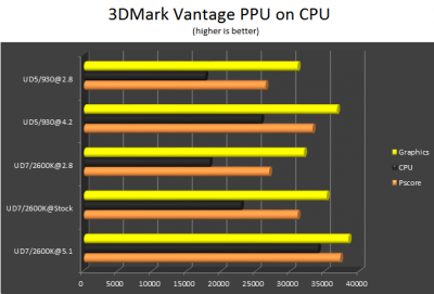"The same thing here, graphics seems to increase with CPU speed, but at clock for clock the P67A-UD7 is faster than the X58A-UD5. But again the margin is a few points, for my standards it has to be 75-100 PTS or above on GPU score for it to be better. I would say that in most cases they are equal. "