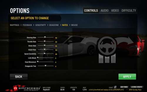 A Lancer Evo X-nél meg 422°-os kormányelfordulást használtam, de sebességérzékeny kormányzás nélkül. A digitális kormányzási arány ahogy néztem, itt nincs hatással a kormányzásra (az rF-ben igen csak fel tudta ez bolygatni az irányítást). Várom a véleményeket és tapasztalatokat ezzel a beállítással kapcsolatban!Egyébként: A kormány nekem is tökmindegy, csak annyi a követelésem, hogy ne ilyen Nintendo WII szerű legyen, hogy a levegőben kormányzol, hanem rögzítve legyen... Az autók terén se vagyok finnyás, mindegyikkel el tudom érni várt eredményt, Simracewayen meg gyakran azon felül is. Bár a négykerék-meghajtású autókkal sose voltam jóban, egy kis gyakorlás után könnyen "kijövünk egymással". A másik még a kormánnyal kapcsolatban, hogy én egy időben nem voltam oda az FFB-ért, mert anélkül kezdtem, anélkül is éreztem jobbnak, de aztán rF-be kipróbáltam ezt a Realfeel plugint, nagyon tetszett, és azóta használom is.