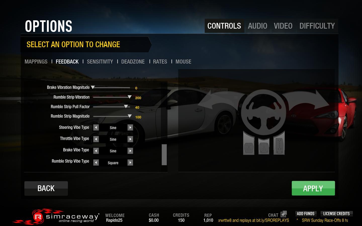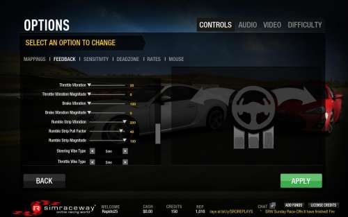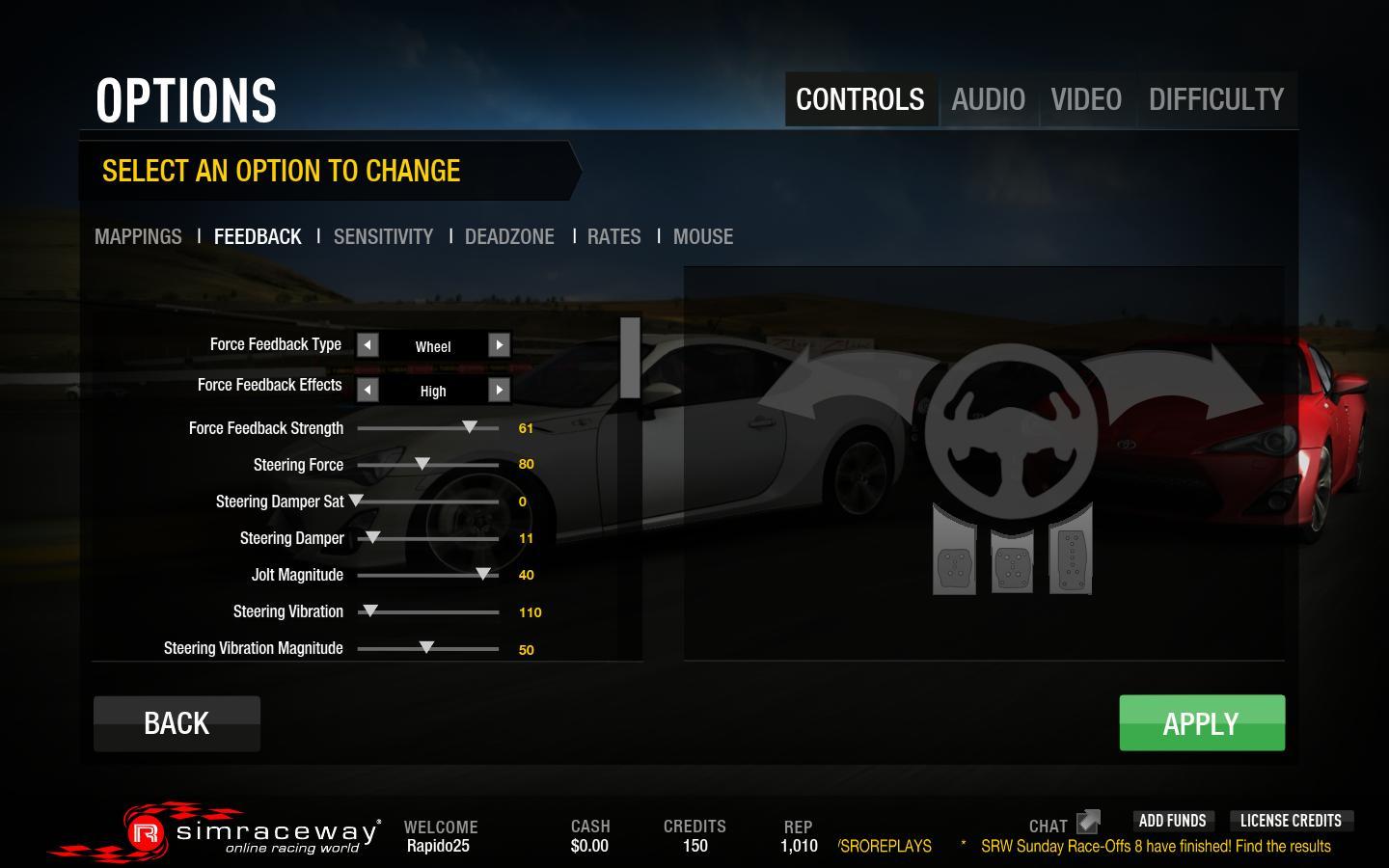 Nos annyit mondanék hogy az FFB nem kicsit tud kib*szni az emberrel. Ez a hirtelen oldalra koppanásig elfordulós cucc ez tipikus rFactor "betegség". Ezt már lehet javítani egy új FFB fizikával amit modderek készítettek a játékhoz (rFactor). Mivel a Simraceway is ilyen háborgós cucc erre orvoslatot nem tudok mondani,