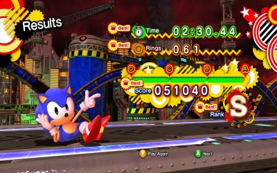 A teljesítményünket egy D-től A-ig terjedő skálán jutalmazza a program, minél gyorsabban végzünk az adott pályával és minél több gyűrűt szedünk össze, annál nagyobb értékelést kapunk. Ha kiemelkedő teljesítményt nyújtunk, akkor megkapjuk az "S" pontszámot, ami azt jelenti, hogy a pályát kiválóan teljesítettük.