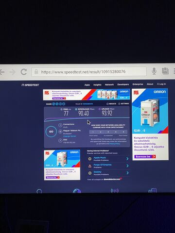 Csináltam TV-re telepített böngészőből sebesség tesztet kábeles kapcsolattal: